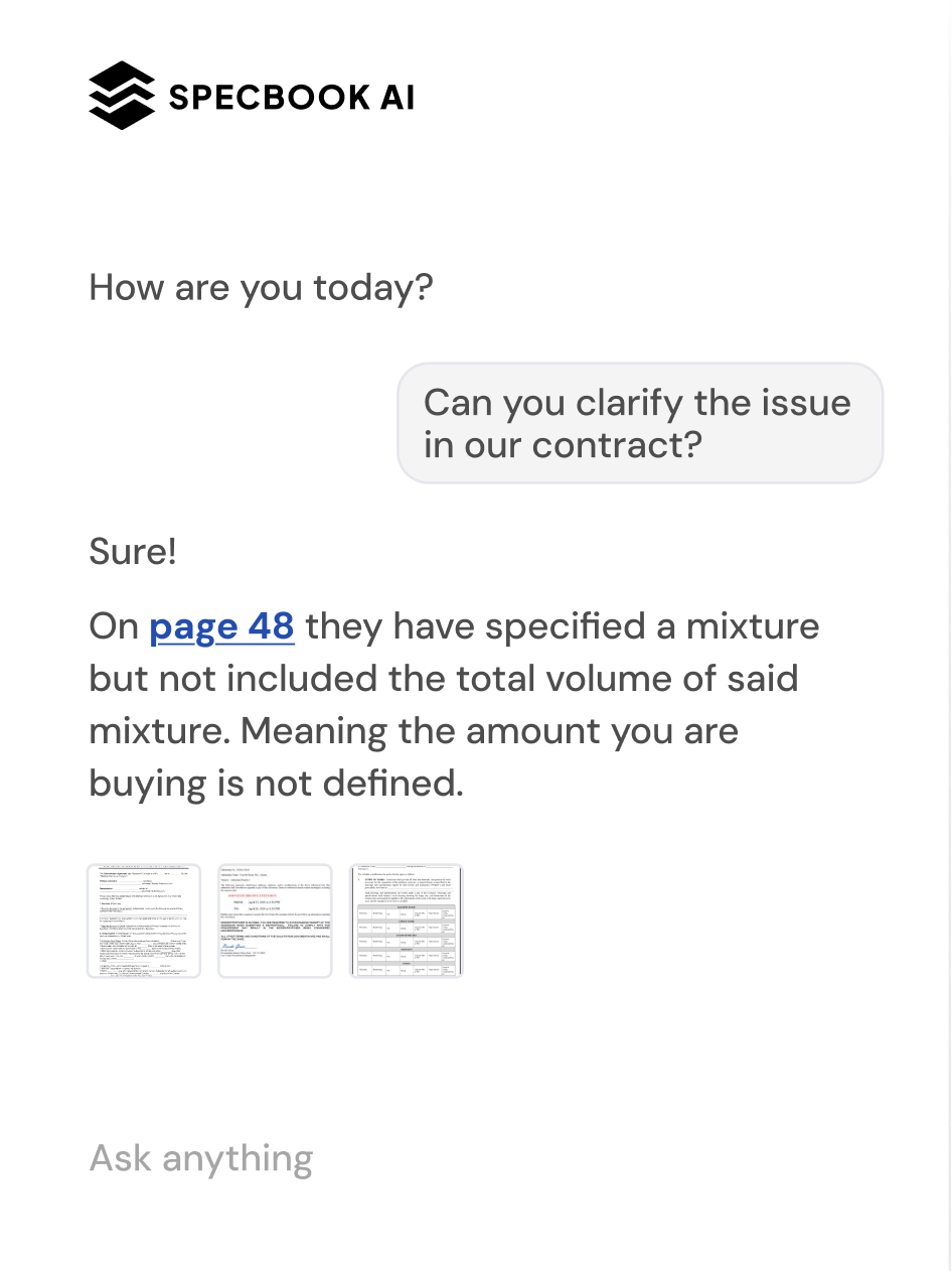 Book a callOur purpose-built AI is designed to handle the most complex specifications with unparalleled accuracy. Get expert-level support on-demand.